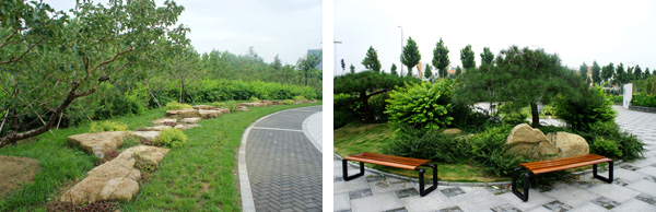 此外,工程中還用到了很多的景觀石,據(jù)高經(jīng)理介紹,這些產(chǎn)自山東的龜紋石,質(zhì)地堅(jiān)硬,表面紋路獨(dú)特,主要用于上、下層苗木之間的過渡,相鄰景觀節(jié)點(diǎn)的分隔處,以及草坪中的點(diǎn)綴等。這些看似隨意但卻自然、和諧的景石擺放,讓生活在都市里的人們感受到了山之秀美、林之繁茂,就像一首無言的詩,一幅立體的畫,和著自然的旋律"輕歌曼舞"。