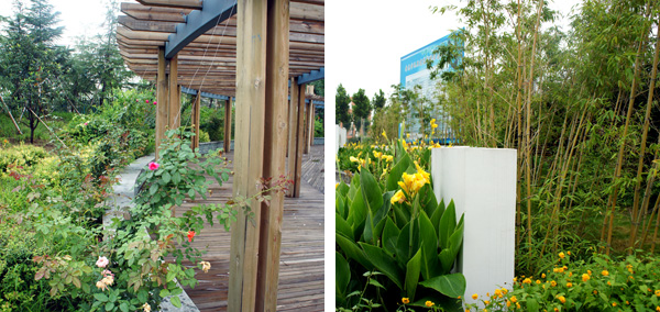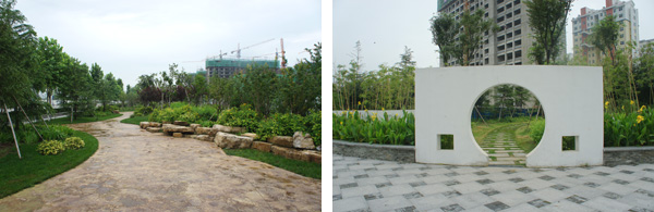 每個景觀節(jié)點(diǎn)上,植物的配置方法都是不一樣的,如在下沉廣場,主要是以小龍柏、金葉女貞等小灌木片植成方形或弧形,間或點(diǎn)綴石楠、梅樹,看起來規(guī)整、簡潔;而在設(shè)計(jì)風(fēng)格為江南園林的南廣場上,是將貴重的造型油松單植,通過不同的組合,形成三個風(fēng)格相近的綠島,周邊種植美人蕉、玉簪、竹子,并砌起白墻,上面開圓形拱門或圓窗,散發(fā)出詩意江南的靜謐和婉約氣息。"游憩步道是貫穿整個景觀的軸線,為了形成曲徑通幽的景觀效果,我們將對植、孤植、叢植都多種方法結(jié)合運(yùn)用,特別是在三叉路口,多種植海棠、櫻花、杏花等,一方面,花開的時候,綠葉間繁花點(diǎn)點(diǎn),會吸引人們不斷向前探尋更多的美景;而花落之后,茂密的枝葉又形成隱隱約約的視覺感受,前方轉(zhuǎn)過彎后風(fēng)景什么樣,又讓人很想去看看。"高經(jīng)理笑著說。