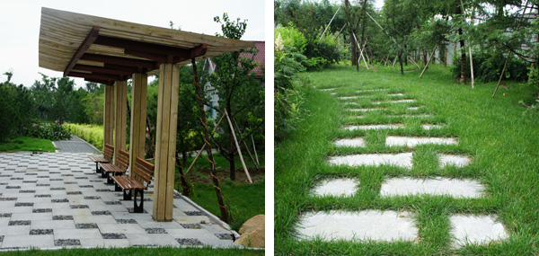 而在道路十字路口的節(jié)點(diǎn)處,則主要是用10cm×10cm的小花崗巖鋪地,鋪出來的路面整潔、平坦,看似簡單,實(shí)則對施工技術(shù)要求相當(dāng)高。草坪中的地面鋪裝,則采用花崗巖汀步,用錯縫鋪裝法,兩塊花崗巖之間用草皮鑲嵌,就像給每塊花崗巖鑲了一道綠邊,與旁邊的草坪和諧地融為一體。貫穿整個工程的游憩步道,全部采用"人字形"的鋪裝方法,中間用透水磚、兩邊以花崗巖鑲邊,透水磚價格不高,用以鑲邊的花崗巖是利用了鋪裝中剩余的邊料,雖然用料簡單,但通過對技術(shù)的嚴(yán)格要求,鋪出的路面卻整潔而不失韻味,是一種實(shí)用、環(huán)保、節(jié)約的做法。