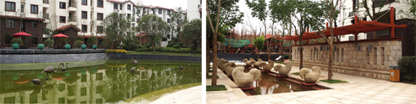 在紫荊東郡小區(qū),水景隨處可見,從主入口兩側(cè)近50米的景觀橋水景,到入口正前方一個大型的石雕噴泉,再到小區(qū)里面幾條主干道交匯的十字路口的小型地面噴泉,中心水景上的圓形石雕噴泉,特別是不遠(yuǎn)處的動物噴泉雕塑,只只鶴低頭凝思,細(xì)長的水流從鼻端的出水口處流出,落入下方的水池里,更是格外引人注目?!斑@些水景小品具有的藝術(shù)特性與審美效果,加強(qiáng)了整個景觀環(huán)境的藝術(shù)氛圍,成為讓空間環(huán)境生動起來的關(guān)鍵因素,在提高小區(qū)藝術(shù)品質(zhì)和景觀形象的同時,更給人們帶來美的享受。”楊經(jīng)理如是說。