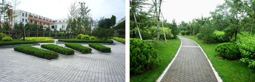 每個景觀節(jié)點上,植物的配置方法都是不一樣的,如在下沉廣場,主要是以小龍柏、金葉女貞等小灌木片植成方形或弧形,間或點綴石楠、梅樹,看起來規(guī)整、簡潔;而在設(shè)計風(fēng)格為江南園林的南廣場上,是將貴重的造型油松單植,通過不同的組合,形成三個風(fēng)格相近的綠島,周邊種植美人蕉、玉簪、竹子,并砌起白墻,上面開圓形拱門或圓窗,散發(fā)出詩意江南的靜謐和婉約氣息?!坝雾降朗秦灤┱麄€景觀的軸線,為了形成曲徑通幽的景觀效果,我們將對植、孤植、叢植都多種方法結(jié)合運用,特別是在三叉路口,多種植海棠、櫻花、杏花等,一方面,花開的時候,綠葉間繁花點點,會吸引人們不斷向前探尋更多的美景;而花落之后,茂密的枝葉又形成隱隱約約的視覺感受,前方轉(zhuǎn)過彎后風(fēng)景什么樣,又讓人很想去看看?!备呓?jīng)理笑著說。
