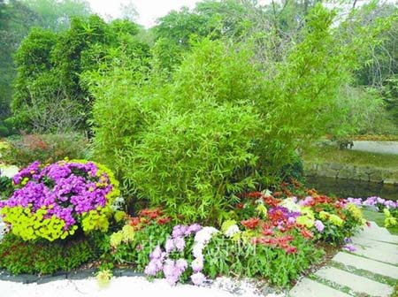 翠竹、菊花相映成趣