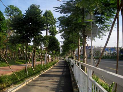眼前的這條道路開闊大氣、綠色生態(tài),而當(dāng)初施工時,卻面臨著很多難題。該項目定位較高,工期短,交叉施工嚴(yán)重,更經(jīng)歷了濱海的臺風(fēng)季節(jié)天氣,所以施工中對施工工序組織、材料組織及機械勞動力的組織顯得尤為重要;由于施工范圍處于交通繁忙的205國道深圳段,對施工現(xiàn)場車輛的疏導(dǎo)及路邊作業(yè)的圍護(hù)等的要求都需嚴(yán)格把控;為了保證景觀效果,對苗木的要求比較高,很多假植的苗木需要用保鮮的方法長途運載到施工現(xiàn)場進(jìn)行種植?!笆┕ぶ忻媾R的各種不利因素不但增加了工程成本,更加大了施工難度,但在項目部全體人員工的共同努力下,最終克服種種困難,圓滿完成了任務(wù),展現(xiàn)了杭州市園林綠化工程有限公司優(yōu)質(zhì)高效、創(chuàng)新進(jìn)取的企業(yè)形象,受到各方的一致好評。”徐向明的一番簡短話語,卻讓我們感受到了施工期間的諸多辛苦。