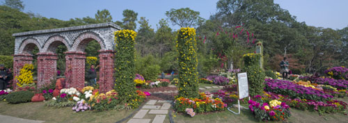 作品最大特色之處在于對原地形的充分利用及合理改造,依山勢,按水理,精細(xì)打造每一個駐步休憩之所,搭配這種菊花,或色彩,或形狀,以此營設(shè)自然而又不失韻味的菊花景觀。最后,讓人融入其中,步伐、氣息、身影混雜交錯,展示出城市生活中人們努力追求或回憶的一種起居文化,亦或是一種清凈、淡雅的“和”文化。