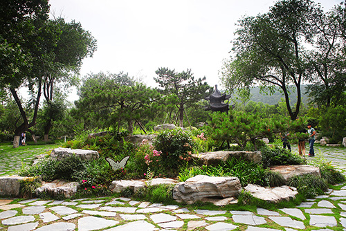 特別是鵠鳴谷,充分利用原有地形,在制高點(diǎn)建立六角重檐亭,即珠山亭,形成全區(qū)的觀景點(diǎn),地面用80mm厚的灰石板自然面亂鋪,縫隙50mm左右,中間種植草皮,通過(guò)增加其他的植物配置,與原有的榆樹(shù)、法桐等大樹(shù)一起,形成古樸、清幽、自然的原生態(tài)景觀群落,成為景區(qū)中的一大亮點(diǎn)。