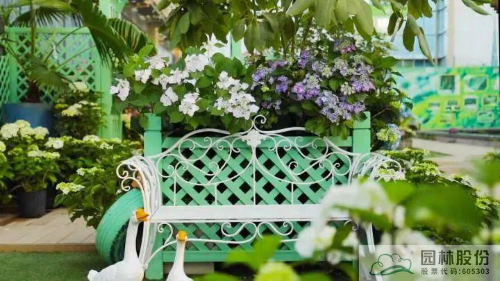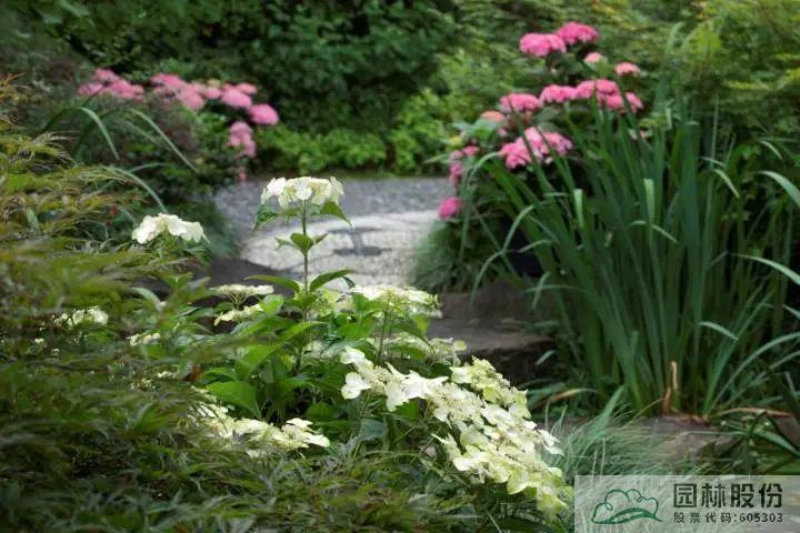 ▲園林股份自主選育的‘青山’系列繡球在畫境·青山湖花園中心室外景觀展示區(qū)中的應用