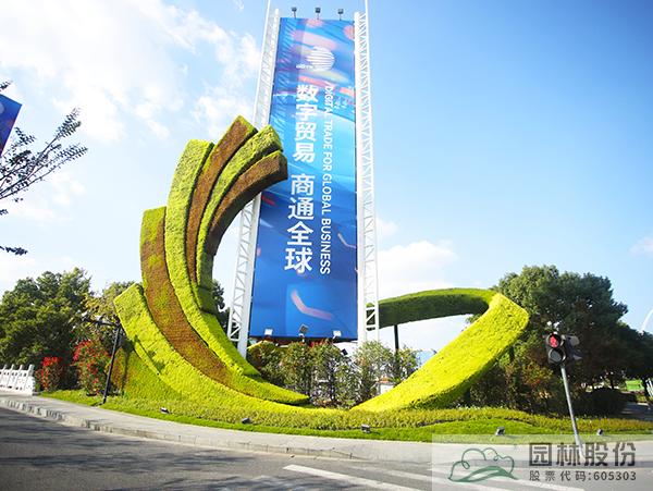 為增加數(shù)貿(mào)展會(huì)主題在邊側(cè)帶內(nèi)設(shè)置3座綠雕:杭扇-以扇子造型主題的全球數(shù)字貿(mào)易博覽會(huì)綠雕,展-以全球數(shù)字貿(mào)易博覽會(huì)會(huì)徽造型綠雕,數(shù)貿(mào)-以飄帶造型主題的“數(shù)貿(mào)錢潮 杭向未來”綠雕。綠雕植物均采用佛甲草和五色草搭配,周邊采用三角梅及花鏡植物配置。港南大道島頭花鏡運(yùn)用金姬錐、彩葉球、細(xì)葉芒、塞娜等植物來強(qiáng)化迎賓氣氛,通過多年生地被草花,結(jié)合精致植物組團(tuán)+特色綠雕,共同營(yíng)造多彩氛圍,打造熱烈迎賓門戶。